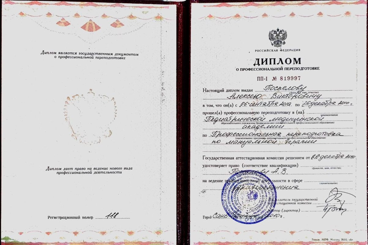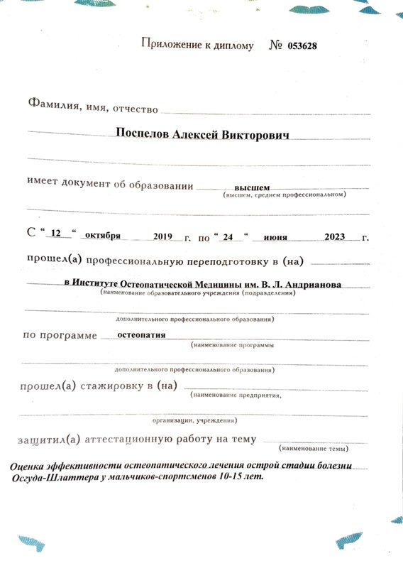 Поспелов Алексей Викторович работает в сфере ортопедии, травматологии, остеопатии и мануальной терапии. В своей работе он чаще всего применяет 2 способа воздействия на тело человека используя только свои руки: прямой и функциональный. Используя первый метод, Алексей Поспелов оказывает воздействие на тело напрямую, что способствует снятию напряжения, а также улучшению подвижности лимфы. Во втором случае доктор убирает зажимы, расслабляя организм без внешних манипуляций.