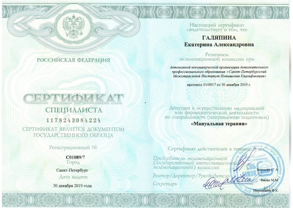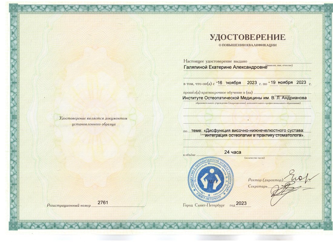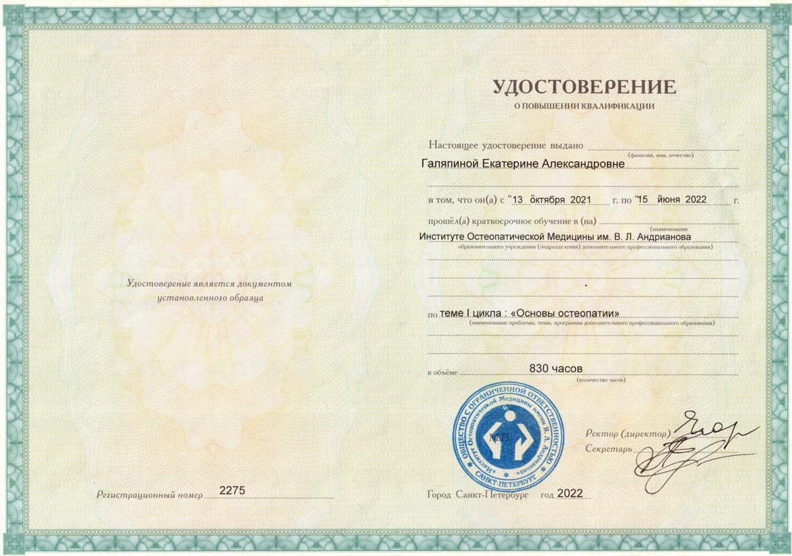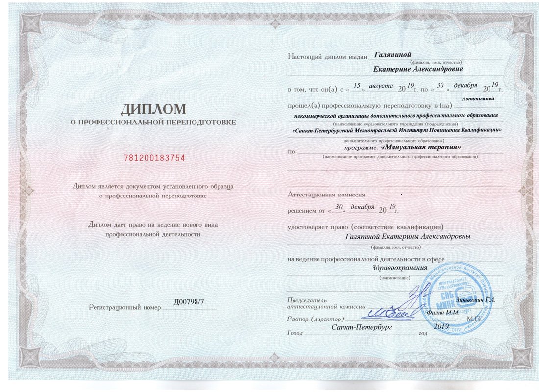 Галяпина Екатерина Александровна является стоматологом, а также работает в сфере остеопатии. В своей практике она чаще всего использует 2 метода воздействия на организм человека используя только свои руки: прямой и непрямой. В первом случае Екатерина Галяпина воздействует на органы напрямую, что способствует устранению напряжения, а также увеличению подвижности лимфы. Во втором случае врач убирает зажимы с помощью расслабления тела без внешних манипуляций.