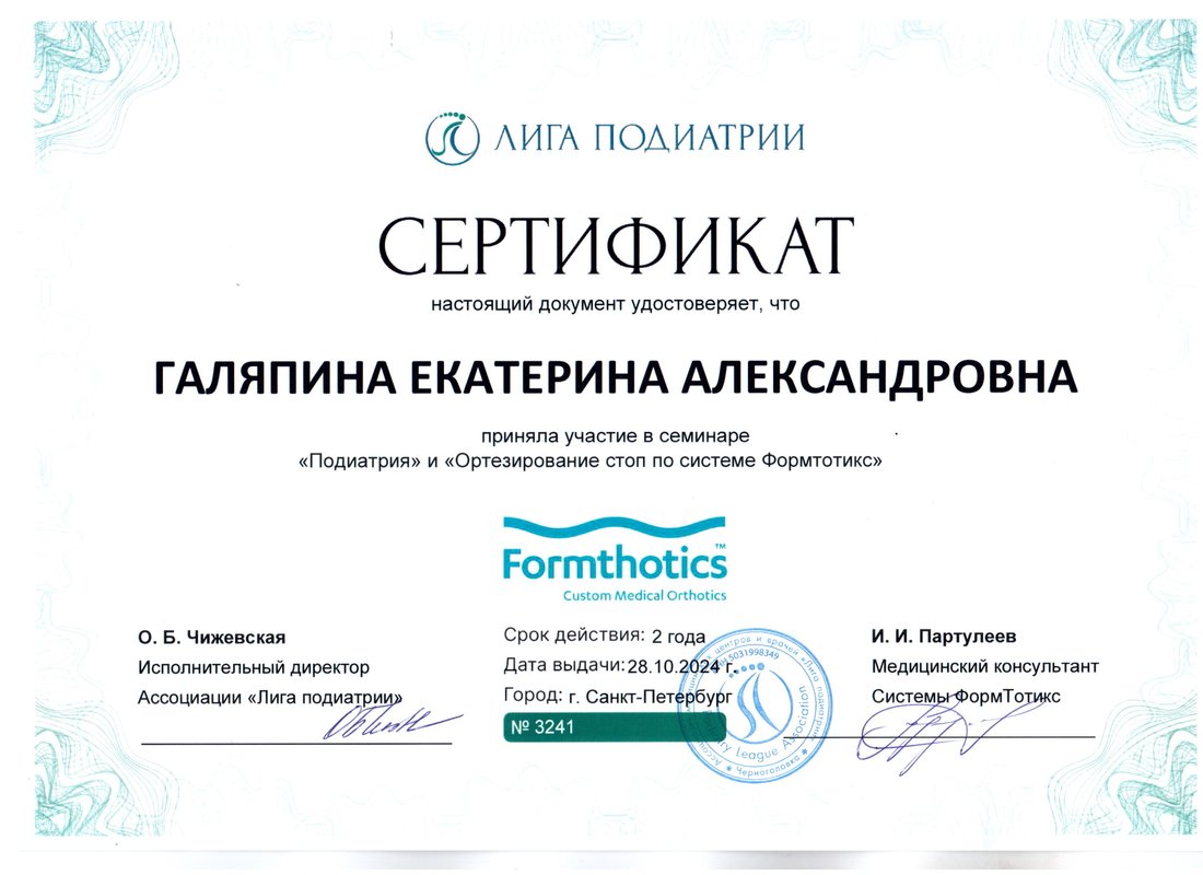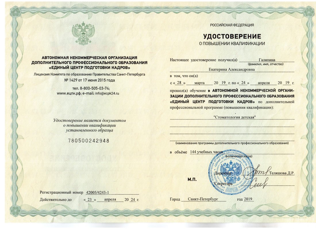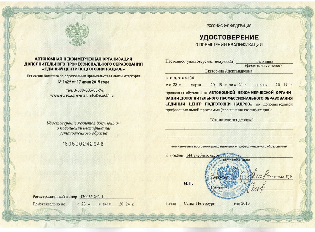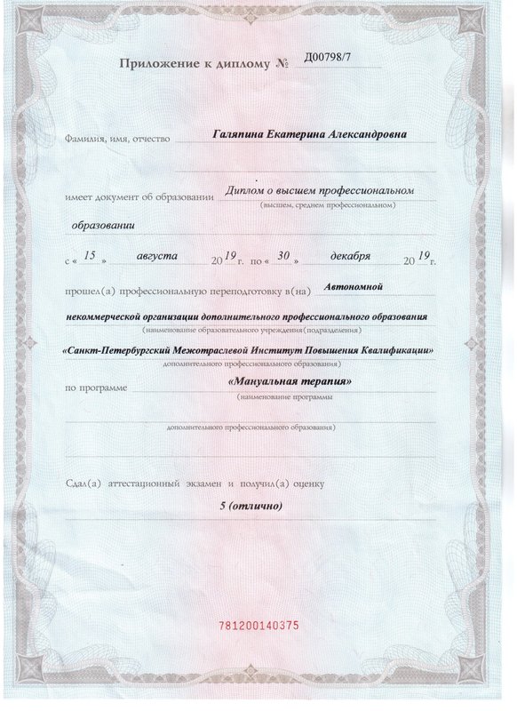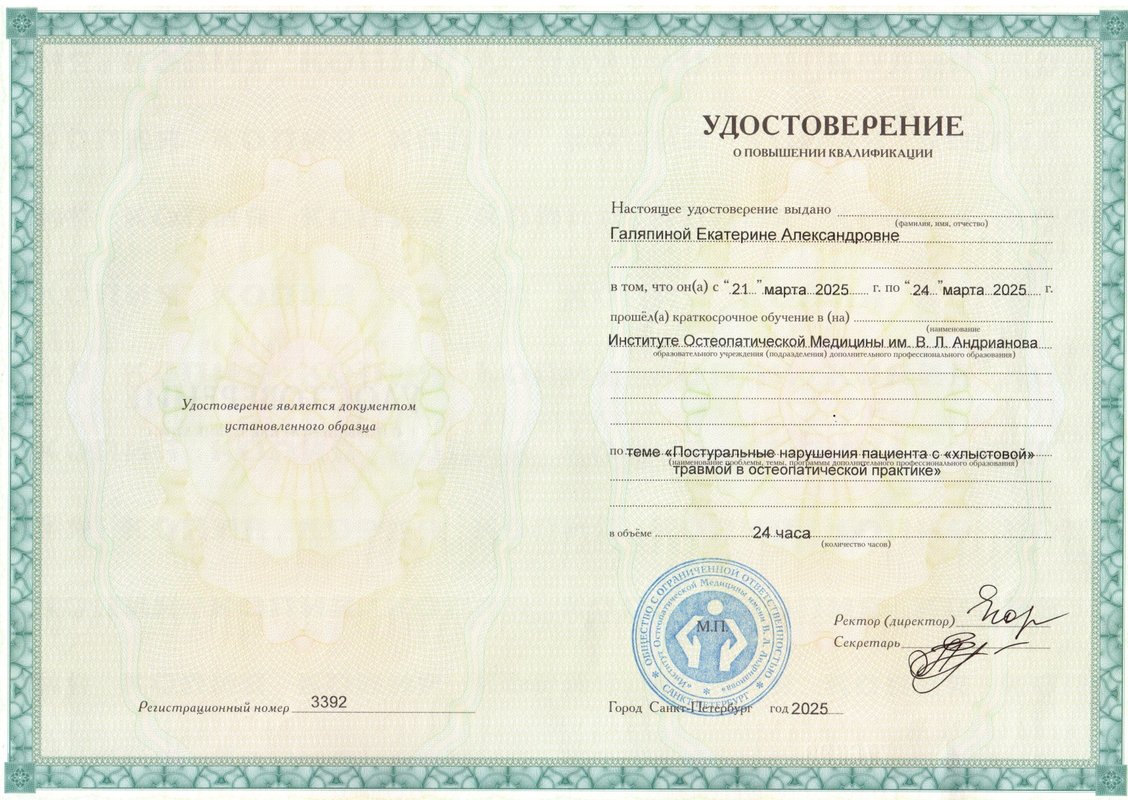 Галяпина Екатерина Александровна является стоматологом, а также работает в сфере остеопатии. В своей практике она чаще всего использует 2 метода воздействия на организм человека используя только свои руки: прямой и непрямой. В первом случае Екатерина Галяпина воздействует на органы напрямую, что способствует устранению напряжения, а также увеличению подвижности лимфы. Во втором случае врач убирает зажимы с помощью расслабления тела без внешних манипуляций.