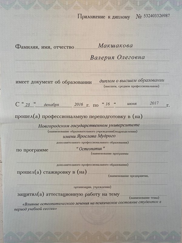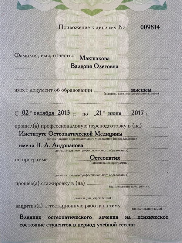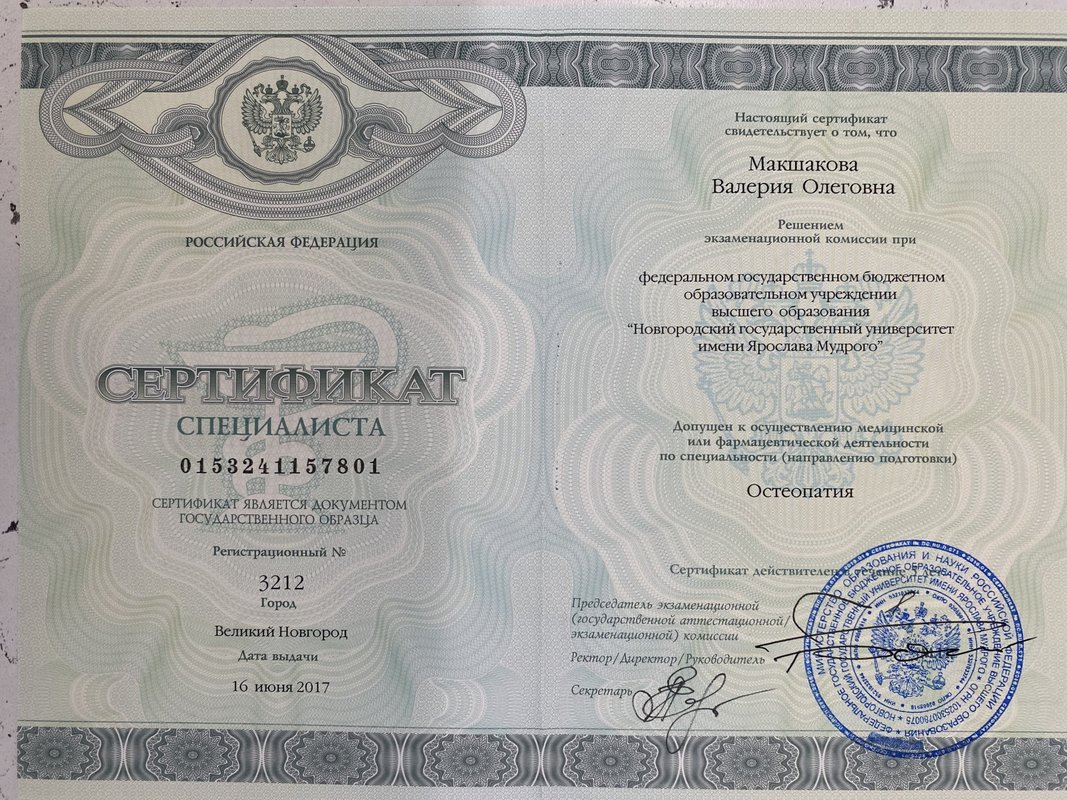 Макшакова Валерия Олеговна работает в сфере неврологии и остеопатии. В своей работе она обычно применяет 2 способа воздействия на тело человека с помощью рук: прямой и функциональный. В первом случае Валерия Макшакова воздействует на тело напрямую, что способствует снятию напряжения, а также увеличению подвижности лимфы. Используя второй метод, доктор убирает зажимы, расслабляя организм без каких-либо манипуляций.