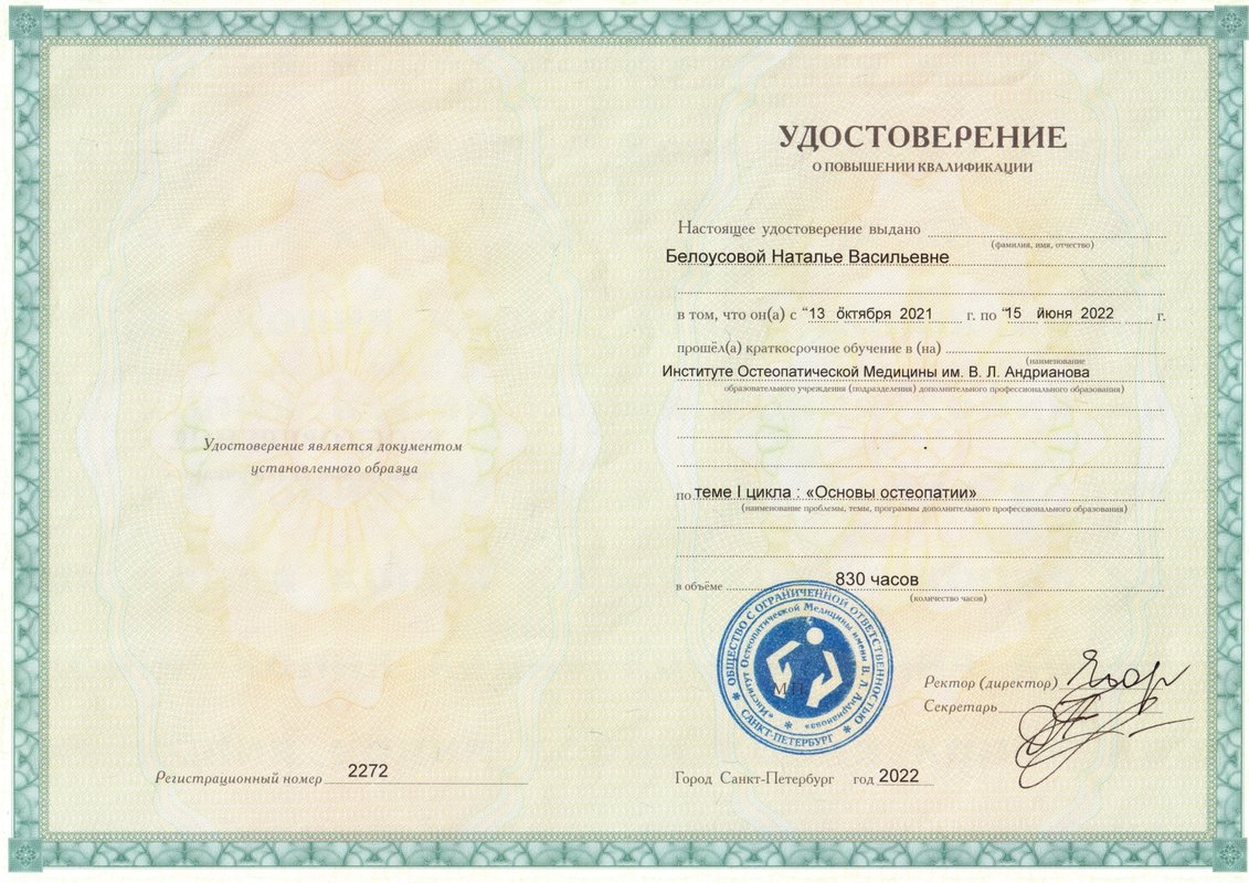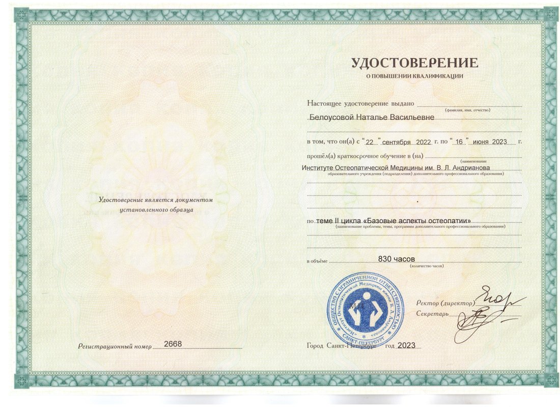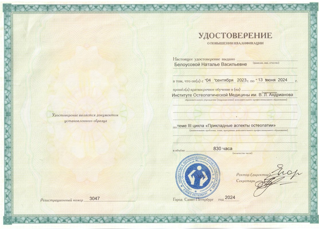 Белоусова Наталья Васильевна является терапевтом, а также работает в сфере мануальной терапии и остеопатии. Наталья Белоусова в том числе обладает знаниями и навыками в области кинезиотейпирования, а также занимается изготовлением индивидуальных ортопедических стелек. В своей работе она обычно применяет 2 способа воздействия на организм человека используя только свои руки: прямой и функциональный. Используя первый метод, Наталья Белоусова воздействует на организм напрямую, что способствует устранению напряжения, а также улучшению подвижности лимфы. Во втором случае врач убирает зажимы, расслабляя организм без каких-либо манипуляций.